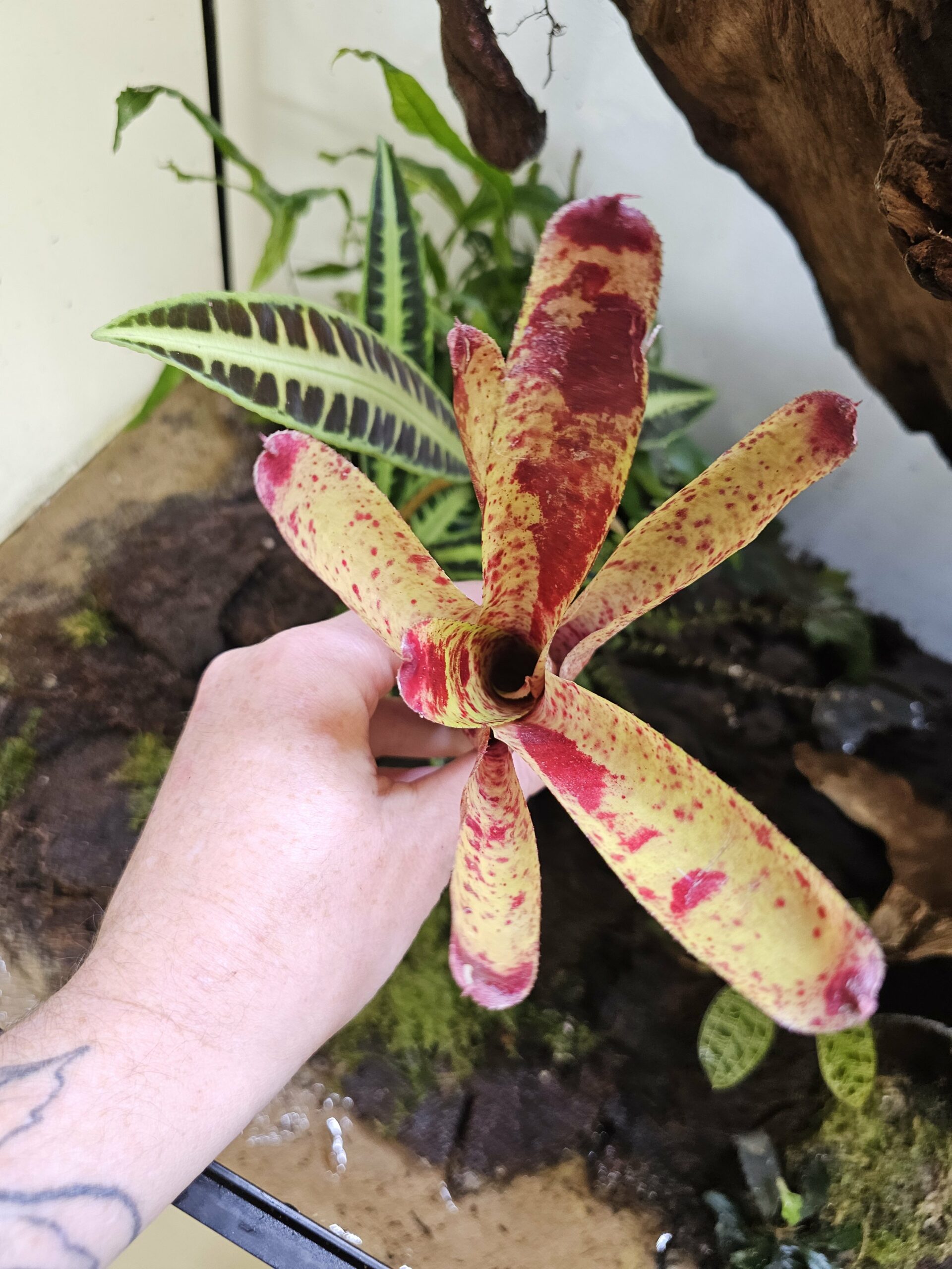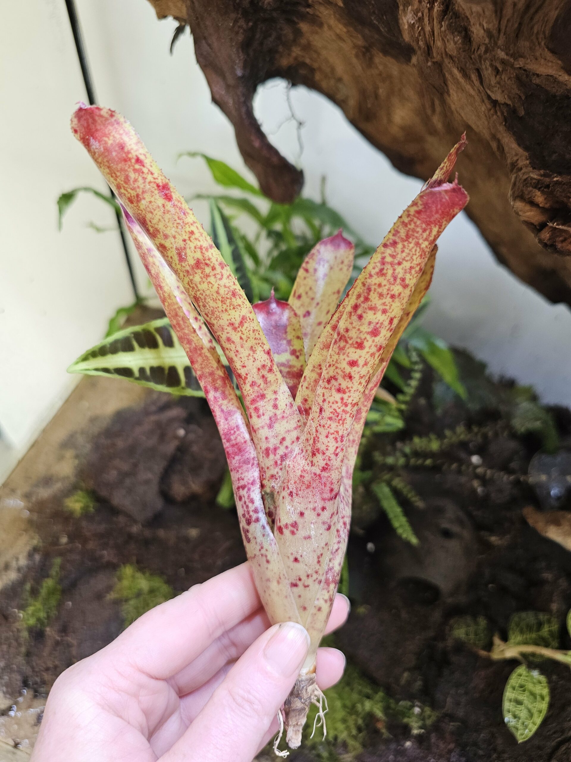 - 💦 Arrosage : Maintenir de l’eau propre dans la rosette centrale et humidifier régulièrement le substrat