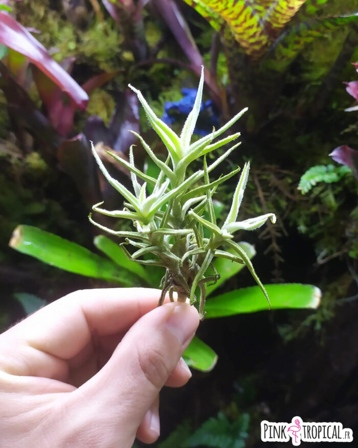 Ce sont des plantes qui aiment être accrochées à une racine ou un morceau de liège. Elles ont besoin d’être pulvérisé légèrement 1 à 2 fois par semaine, elles doivent sécher entre deux arrosages et ne pas avoir le cœur humide au risque de la voir mourir. Pour cela, tu peux prendre l’habitude de les retourner, tête en bas après les avoir arrosées pour enlever l’excédant d’eau.